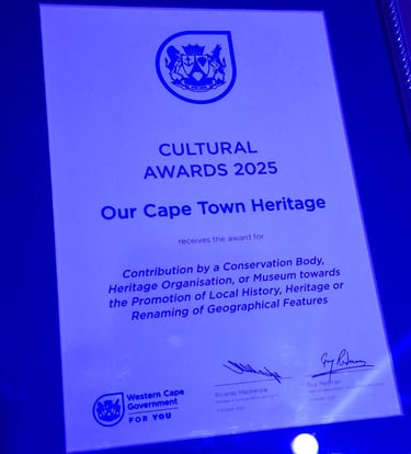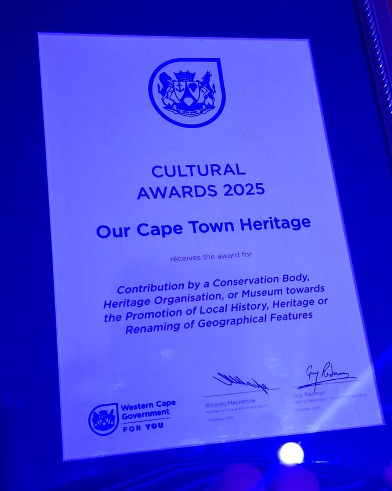 Our Cape Town Heritage is honoured to announce that we have received the following award from the Western Cape Government DCAS: