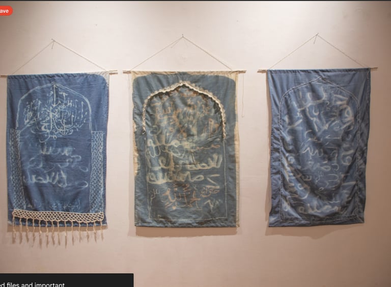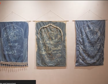 A series of prayer mats made from cotton fabric with calligraphy painted onto it. Crochet Arabic text creates an exploration of spirituality