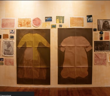 Life-size lumen prints made from a salah top handed down to me, and my wedding dress. One represents a new chapter; one connects me to my mother and grandmother