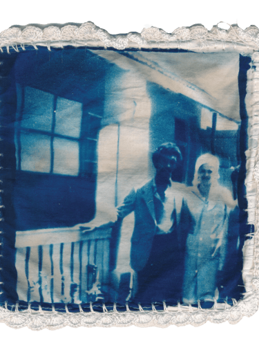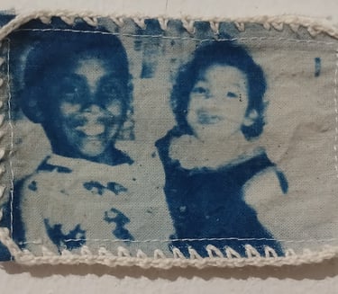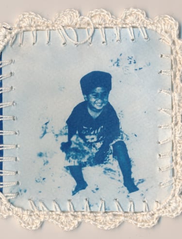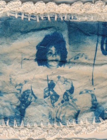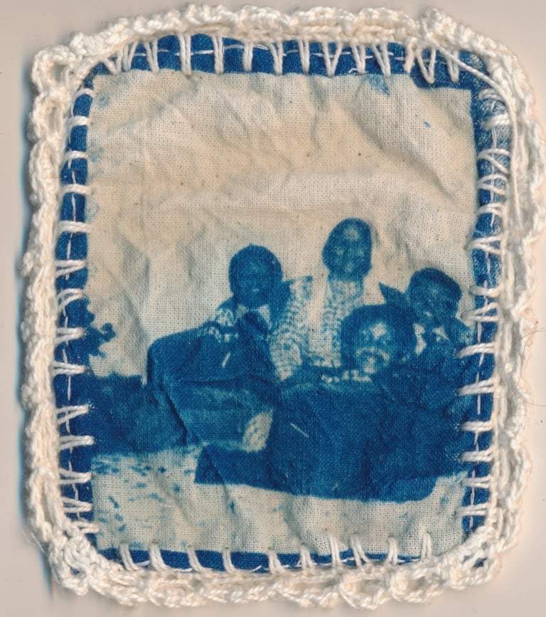 Akhi (Brother), Cyanotype on cotton fabric with crochet border