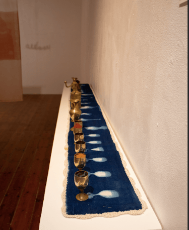A cyanotype on a long piece of cloth, made using my grandmother's brass collection