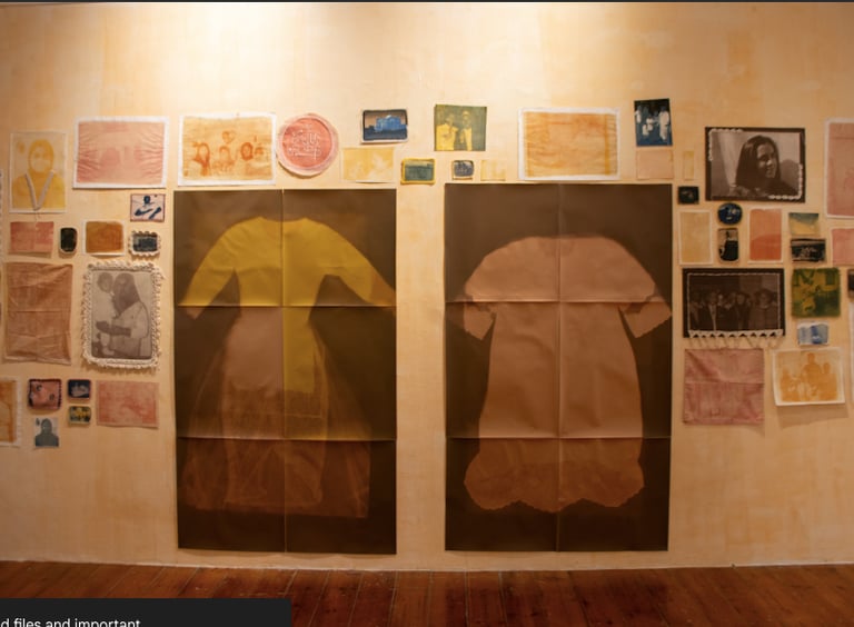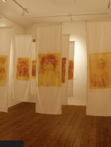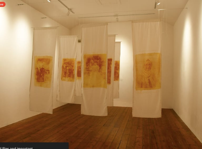 Cotton fabric sewn into hijabs, with images of the matriarchs of my family. Made using spices to sun print images of myself, my mother, my aunty and my grandmother