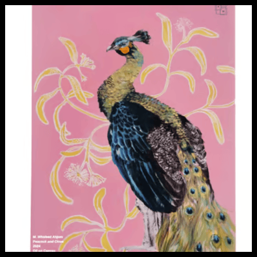 “Inspired by the Indonesian Green peacock; though less well known than its cousin from the Indian subcontinent. The stately bird is placed before the batik-inspired motif of stylized cloves and clove buds.