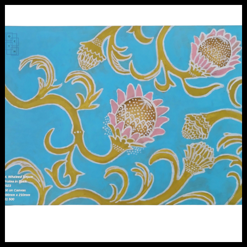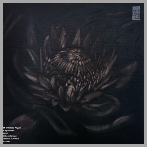 “The protea was chosen as a symbol for national identity but is believed that they are endemic to the Cape, not nationwide. Furthermore, proteas are found both in the South Americas and Australia, both regions sporting a greater variety. This series highlights the exoticization of flora. In the Dutch tradition of still-life painting, the floral subjects were a jeer of sorts. The flowers would never exist in the same time or place, as their seasons and climes would have made it impossible at the time, but it was a sort of trophy wall of exploited lands and people. Every petal would have cost many lives for the bouquet. Civilizations were destroyed and families were torn asunder, exiled or enslaved.”