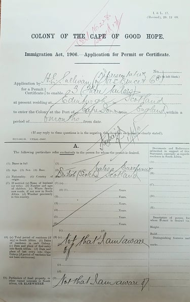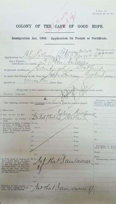 Immigration papers for three tailors from Scotland to enter the Cape. Dated 1910. Courtesy of Cape Town Archives